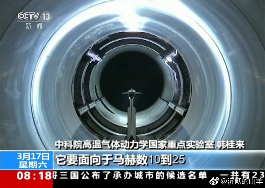 中央电视台3月16日新闻节目中,采访了北京中科院高温气动力国家重点实验室,在采访中,该机构研究员韩桂来介绍,该单位正在研制新的风洞,这个风洞模拟马赫数可以达到10-25。目前美国最先进HYPULSE风洞的测试速度与中科院正在研制的新型风洞类似。这种类型风洞代表了世界最高技术水平。