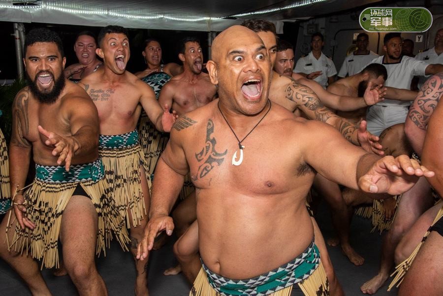 环太平洋2018军演已经拉开大幕,而在军演之外参演各国海军也是联谊中展示本国特色,比如新西兰海军身穿土著毛利人服装跳起战舞。