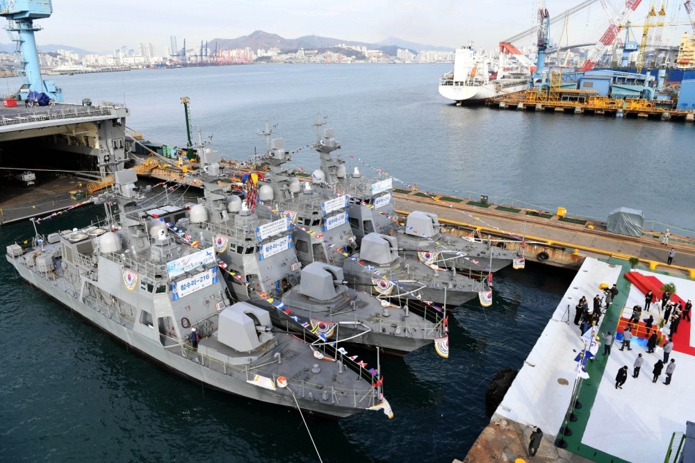 12月13日下午2点韩国海军在韩国韩进重工釜山造船厂举行4艘新型高速艇:PKMR-216(Patrol boat Killer Medium, Rocket)、PKMR-217、PKMR-218、PKMR-219下水仪式。